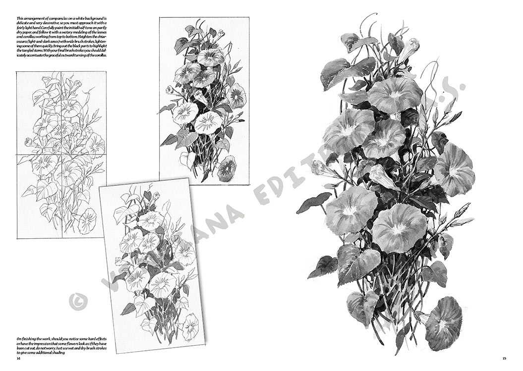 Una rassegna di fiori interamente realizzati con colori ad acquerello, le pagine dedicate al bianco e nero sono realizzate con tecnica a mezzatinta acquerellata (lavis).
